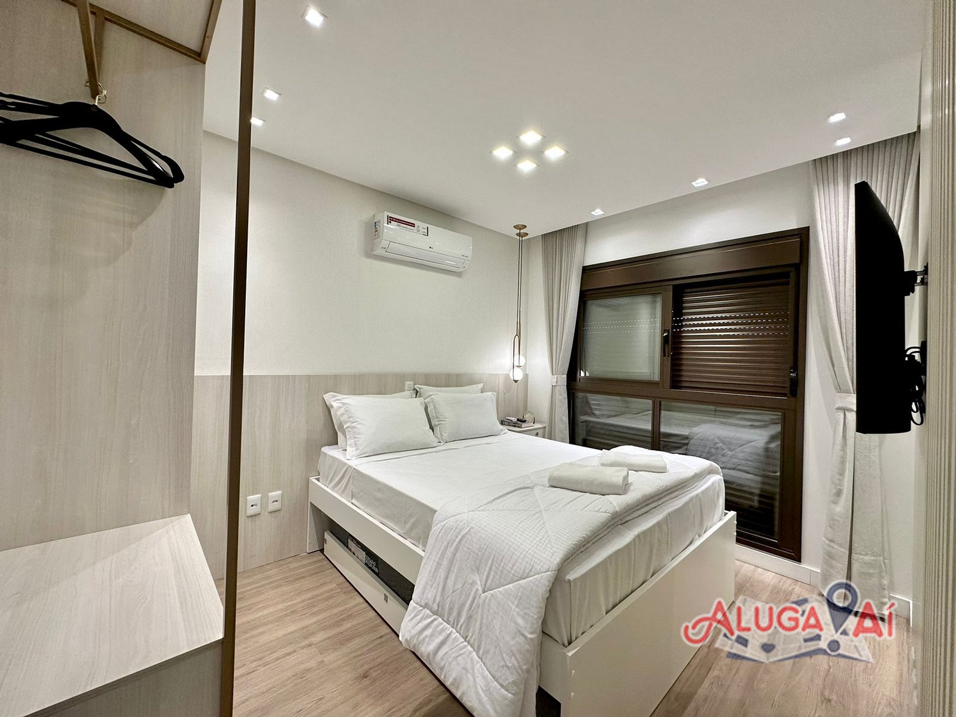 Suíte 1 com cama Queen Size, cama auxiliar solteiro , ar condicionado q/f, rouparia completa e SmartTV 43';
