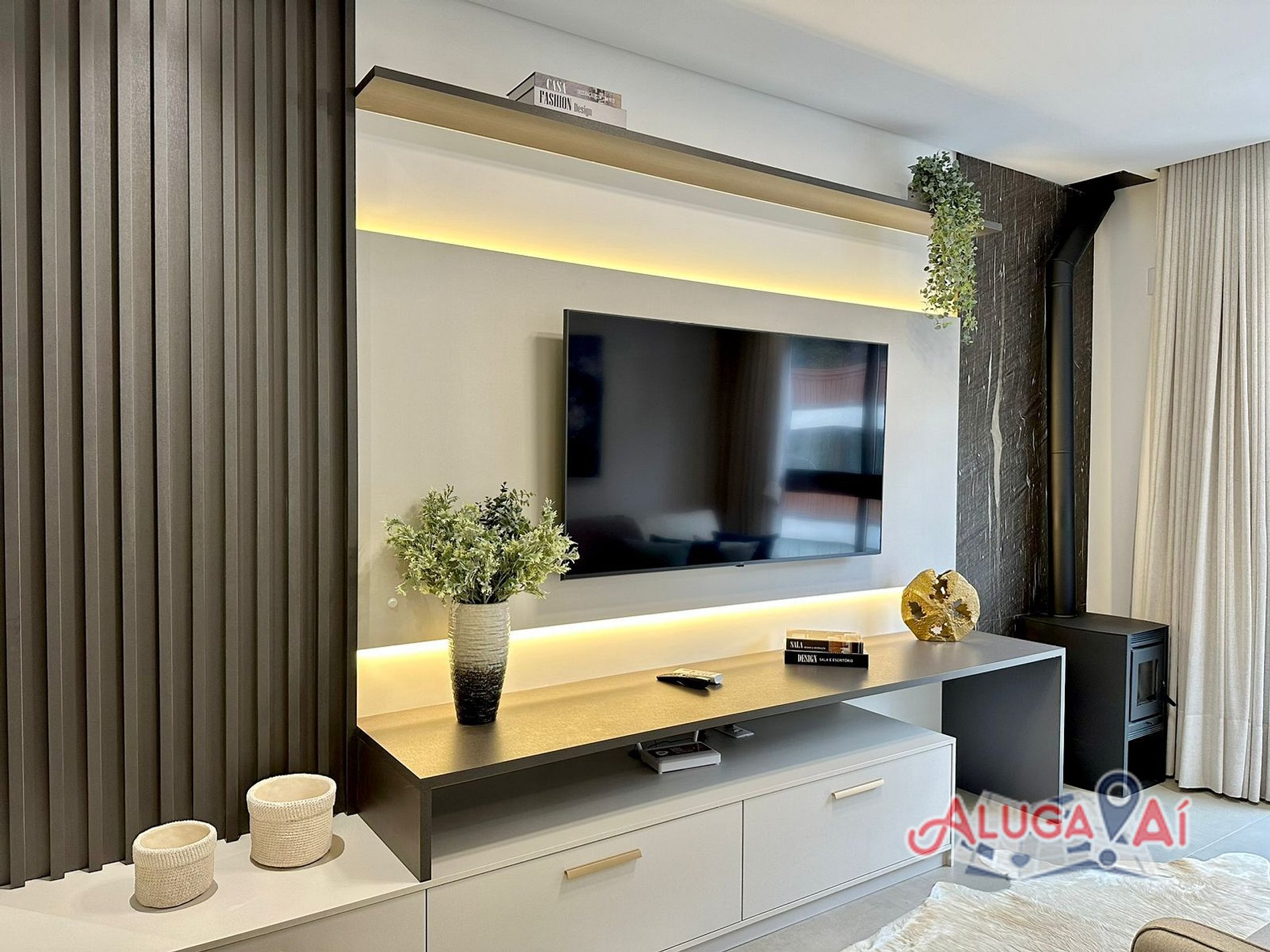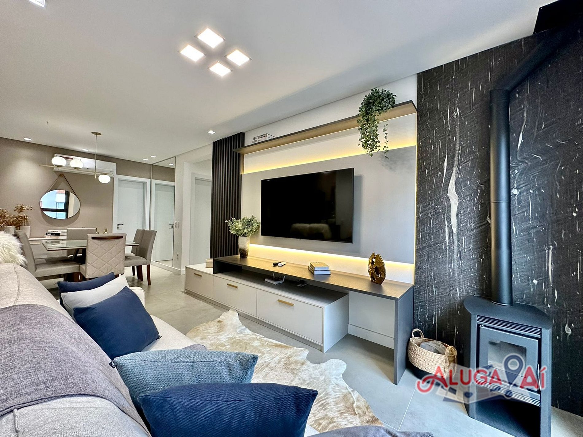 Nosso apartamento conta com Living em dois ambientes SmartTV 60’, sofá cama, split q/f, lareira/estufa à lenha e mesa de jantar para até 6 pessoas;