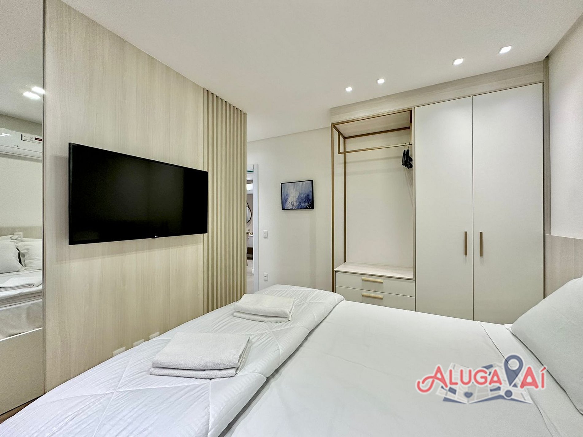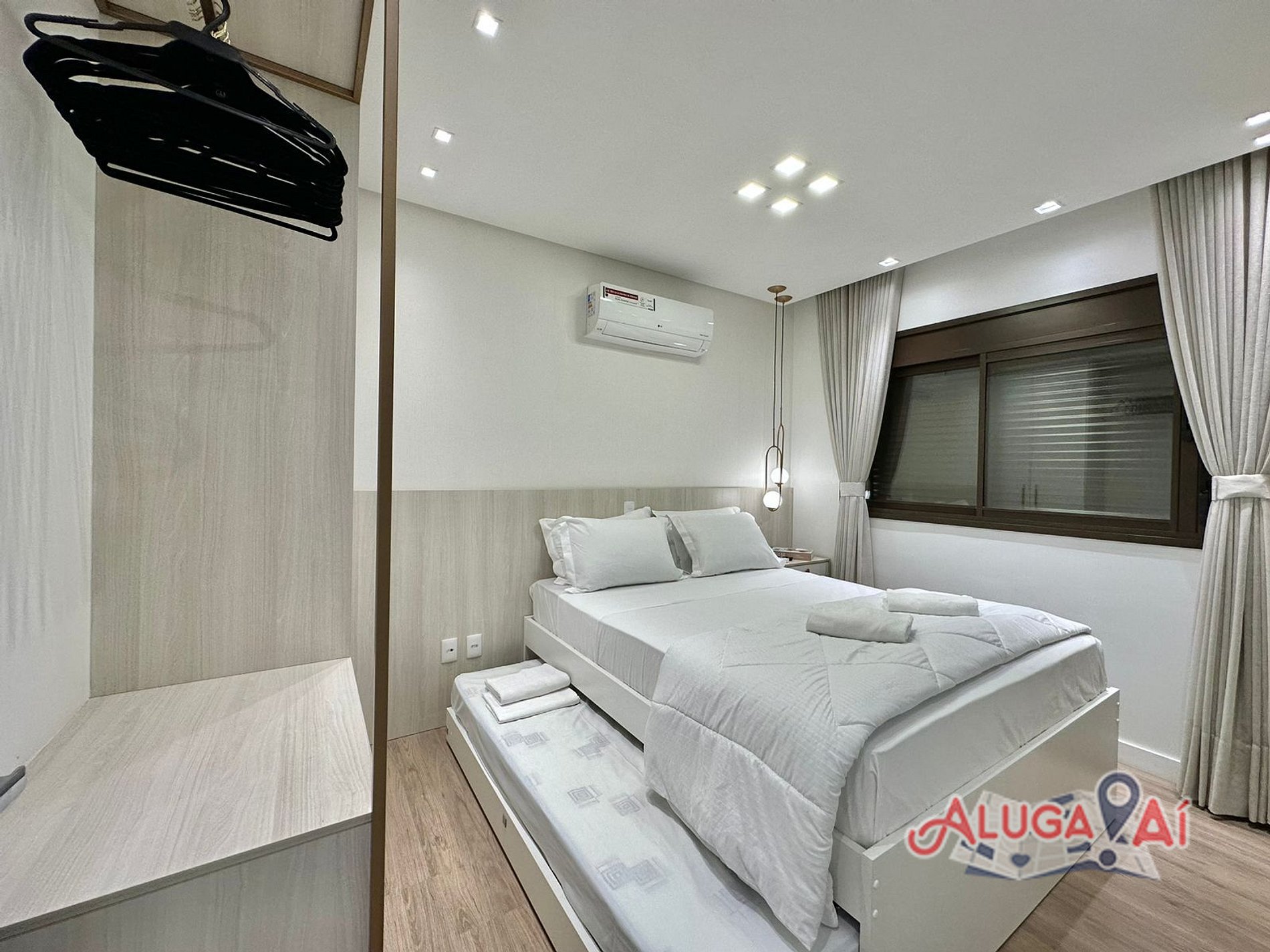 Suíte 1 com cama Queen Size, cama auxiliar solteiro , ar condicionado q/f, rouparia completa e SmartTV 43';