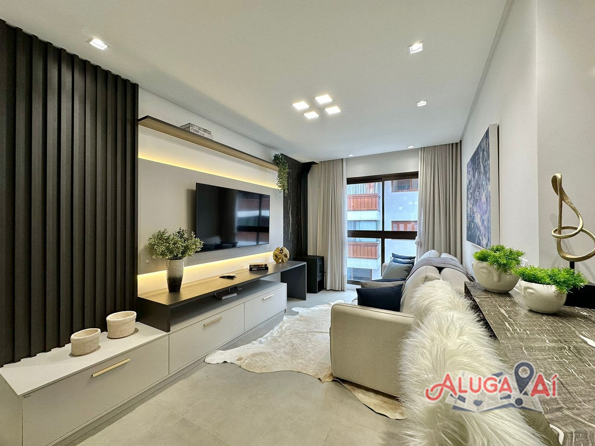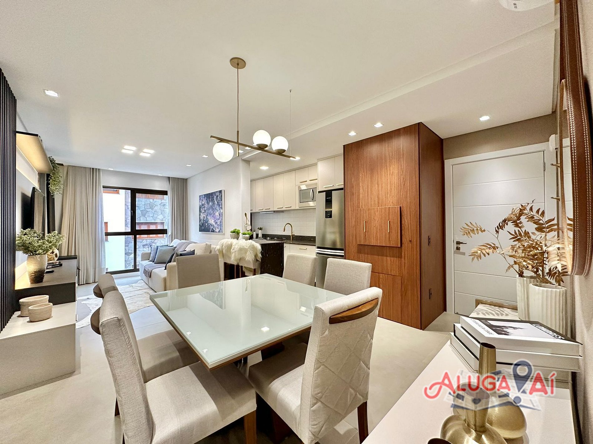 Nosso apartamento conta com Living em dois ambientes SmartTV 60’, sofá cama, split q/f, lareira/estufa à lenha e mesa de jantar para até 6 pessoas;