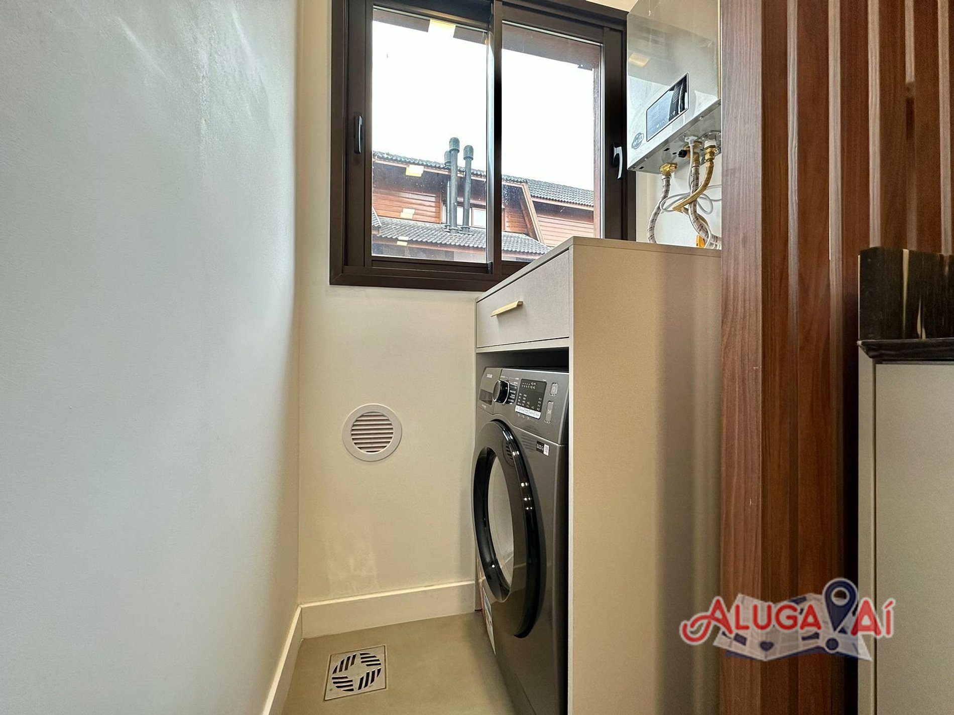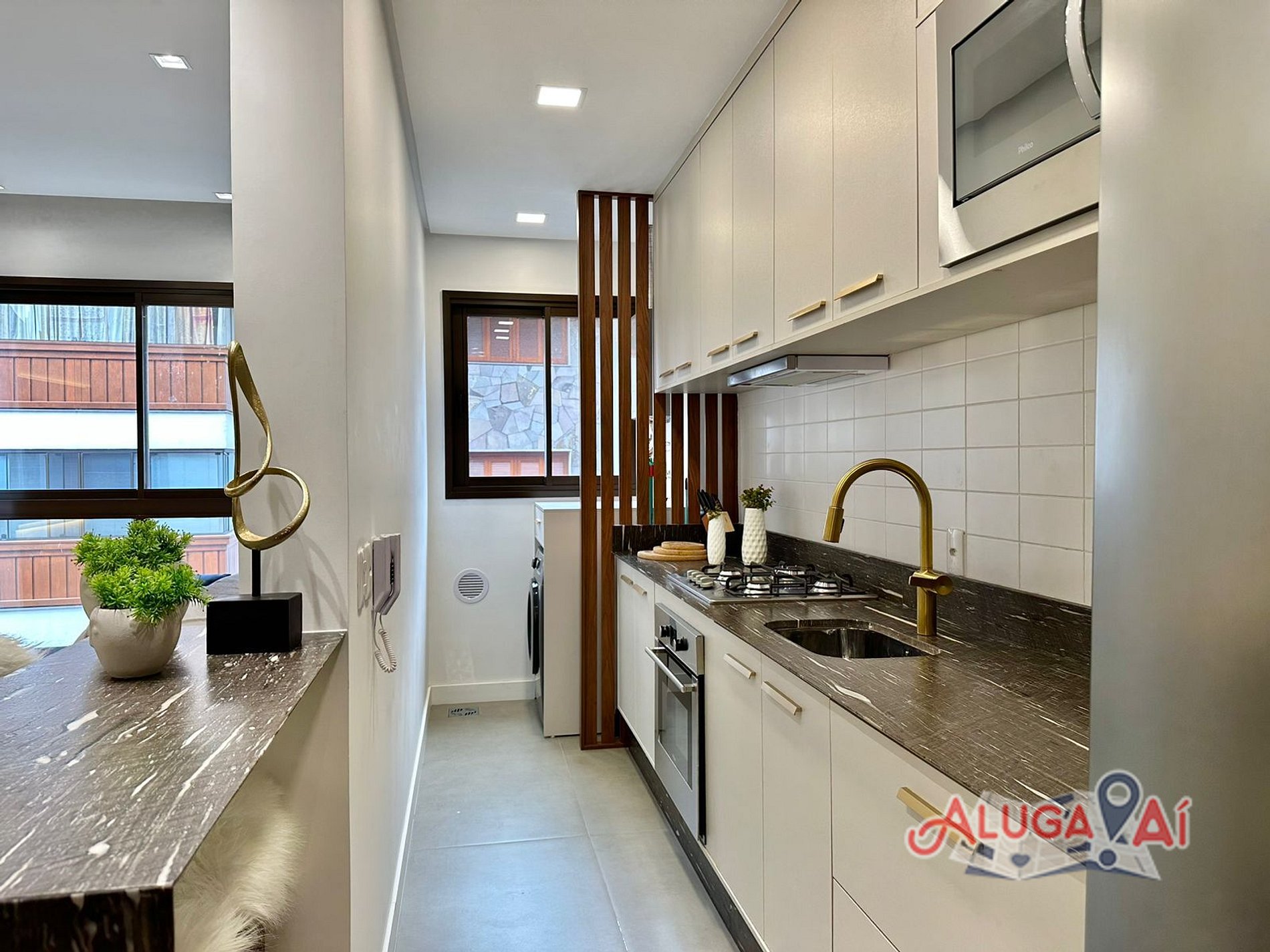 Cozinha completa, com churrasqueira e lavanderia com máquina lava e seca;